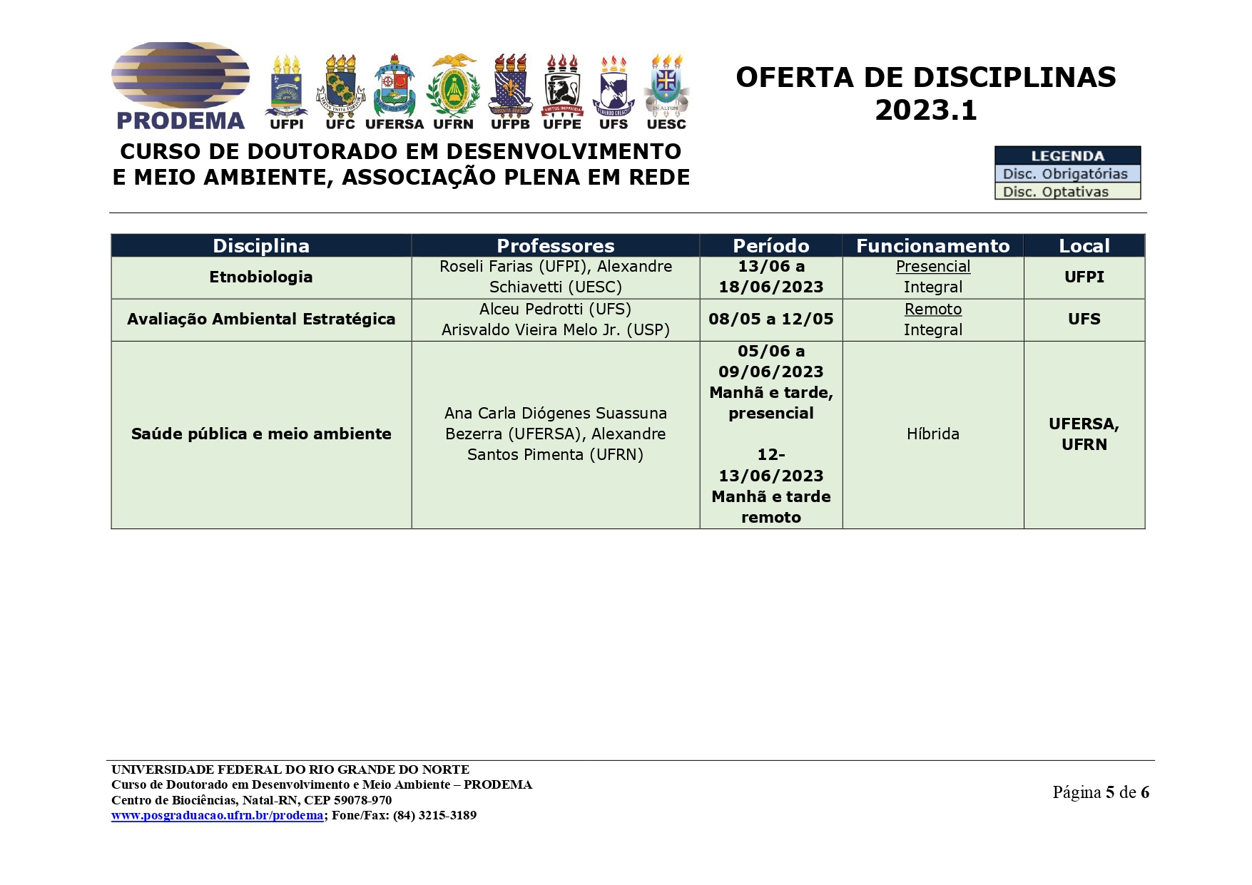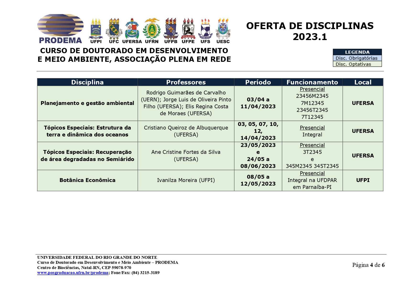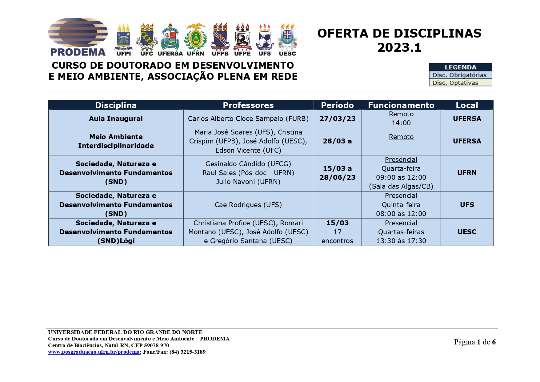 A Coordenação Geral do Curso de Doutorado em Desenvolvimento e Meio Ambiente, Associação Plena em Rede, divulga a Oferta de Disciplinas para o Semestre 2023.1