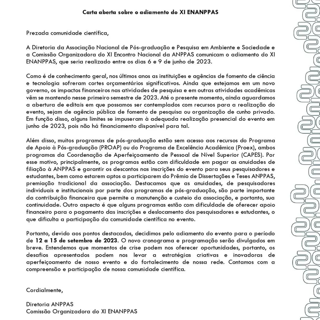 Carta aberta sobre o adiamento do XI ENANPPAS